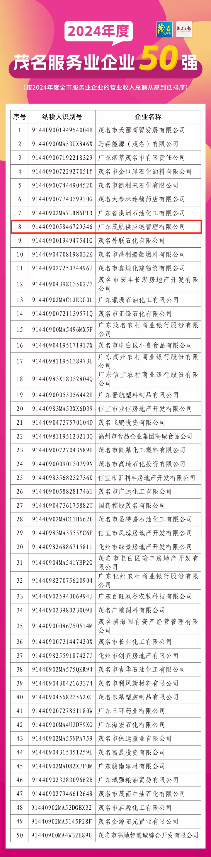 根據(jù)茂名市企業(yè)聯(lián)合會于2025年7月15日發(fā)布的通報(bào),集團(tuán)下屬茂航供應(yīng)鏈公司以優(yōu)異的業(yè)績表現(xiàn)位列茂名企業(yè)100強(qiáng)第23位,較2023年第37位躍升14名,并首次躋身茂名服務(wù)業(yè)企業(yè)50強(qiáng)第8位。此次雙榜單的歷史性突破,標(biāo)志著茂航供應(yīng)鏈公司從傳統(tǒng)供應(yīng)鏈貿(mào)易商向供應(yīng)鏈科技企業(yè)的轉(zhuǎn)型取得實(shí)質(zhì)性成果。